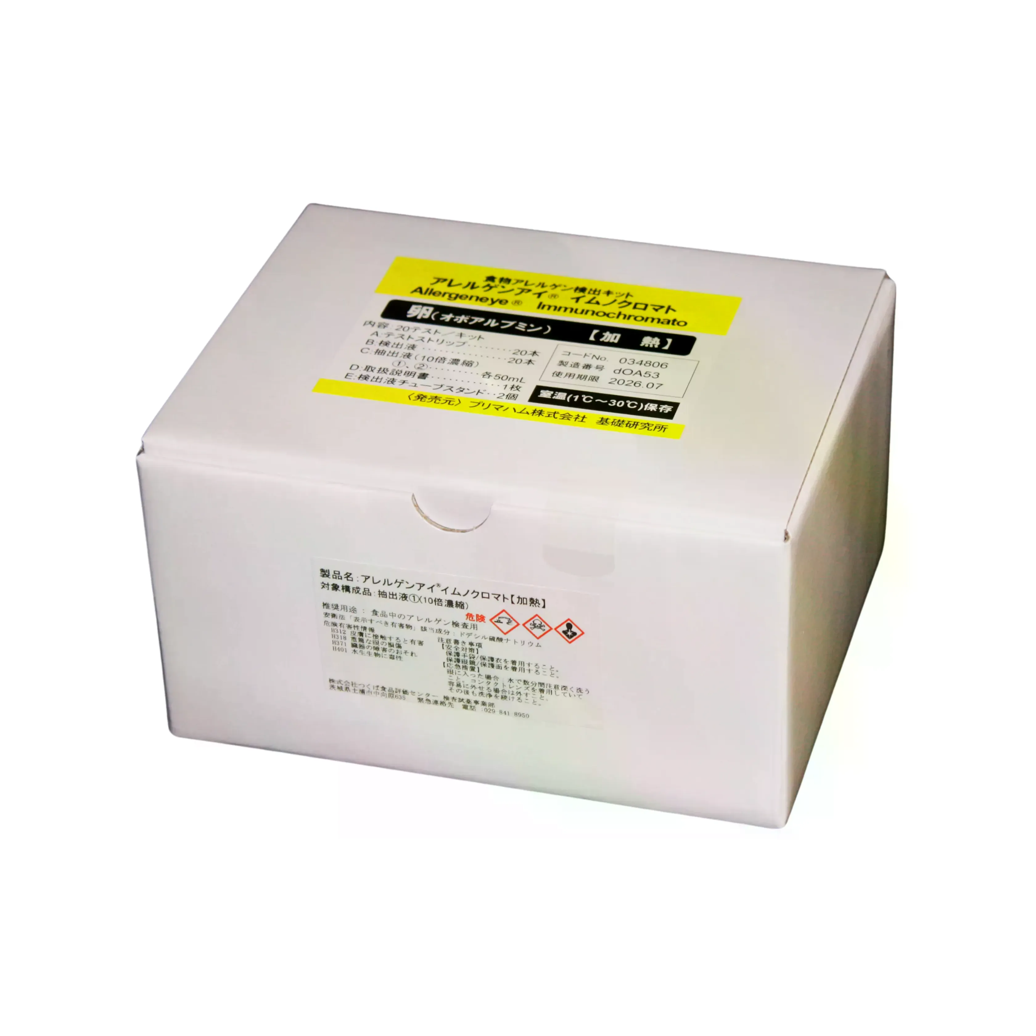 | 仕様 | ●検出項目:卵(加熱用) ●入数:20回分 ●検出感度:食品中のアレルゲンタンパク質2ppm ●テスト時間:20分 ●保存方法:1~30℃(室温) ●セット内容:テストストリップ(個包装・乾燥剤入)/20本、検出液(凍結乾燥品)/20本、抽出液(10倍濃縮)/50mL×2本 ●※本キットは食品中の特定原材料を測定する研究用試薬で、アレルギー症状の発症を診断する臨床検査薬ではありません。アレルゲン摂取量とアレルギー症状との相関は不明です。 |
