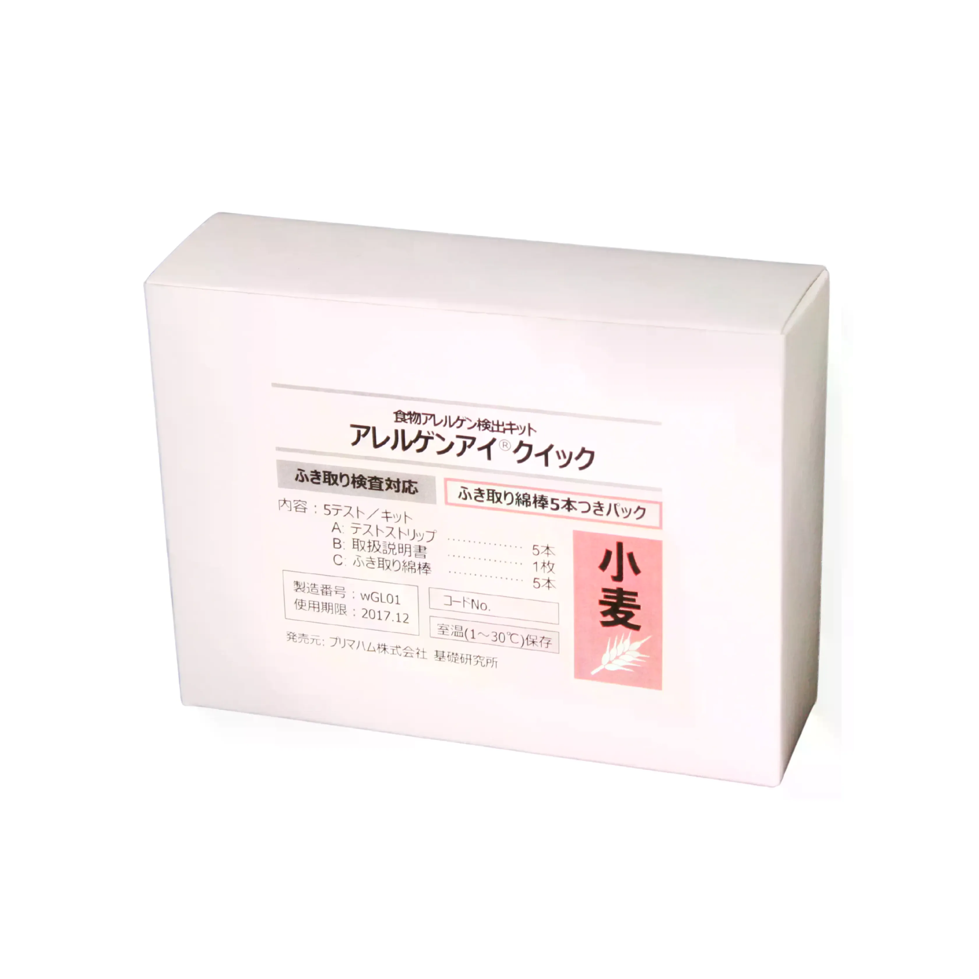 | 仕様 | ●検出項目:小麦 ●仕様:ふき取り綿棒5本付パック ●検出感度:検査試料中0.2ppm(対象食物アレルゲンの総タンパク質) ●テスト時間:10分 ●保存方法:1~30℃(室温) ●セット内容:テストストリップ(個包装・乾燥剤入)×5本、ふき取り綿棒(内容液: リン酸緩衝生理食塩水(滅菌済) 10 mL/本)×5本 |
