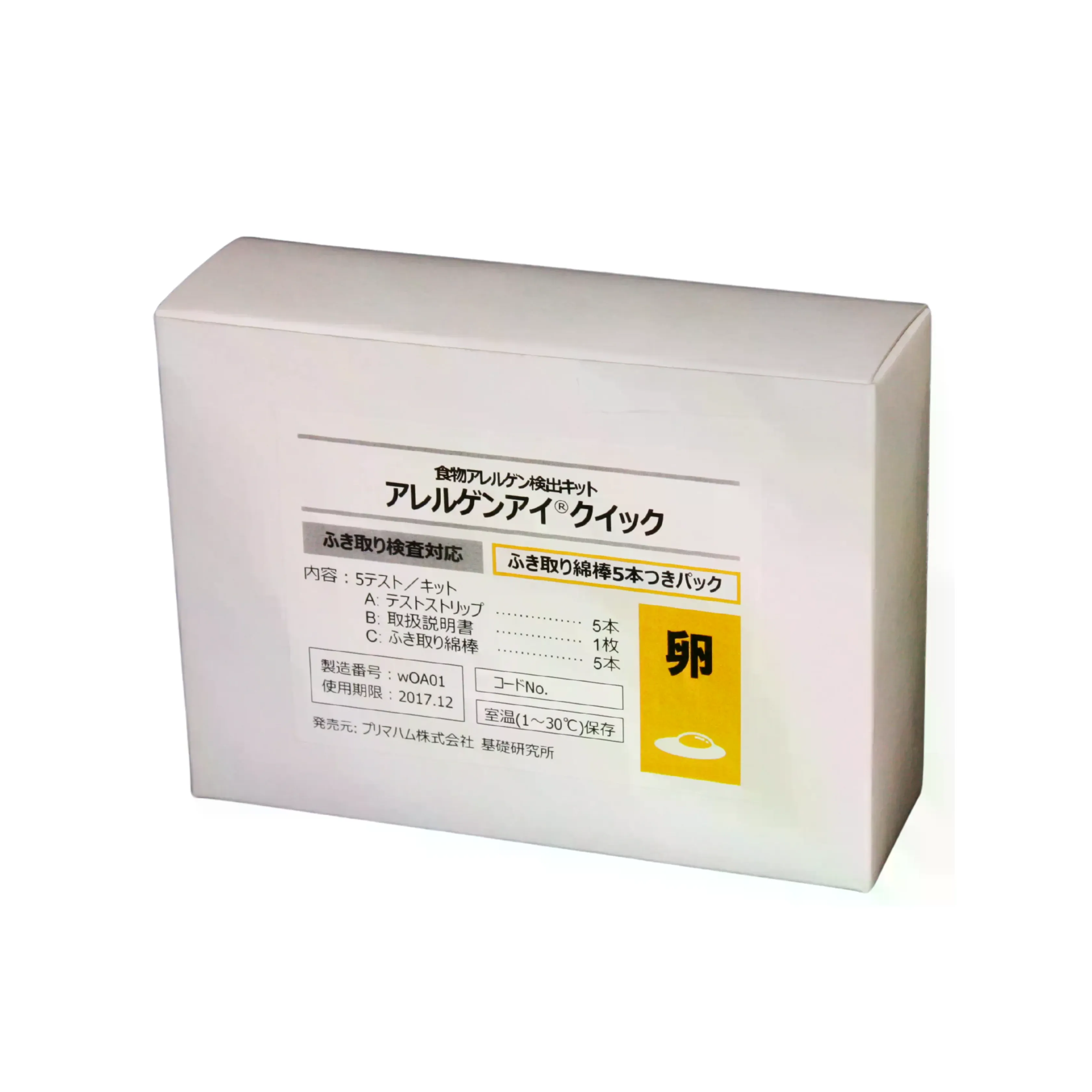 | 仕様 | ●検出項目:卵 ●仕様:ふき取り綿棒5本付パック ●検出感度:検査試料中0.2ppm(対象食物アレルゲンの総タンパク質) ●テスト時間:10分 ●保存方法:1~30℃(室温) ●セット内容:テストストリップ(個包装・乾燥剤入)×5本、ふき取り綿棒(内容液: リン酸緩衝生理食塩水(滅菌済) 10 mL/本)×5本 |