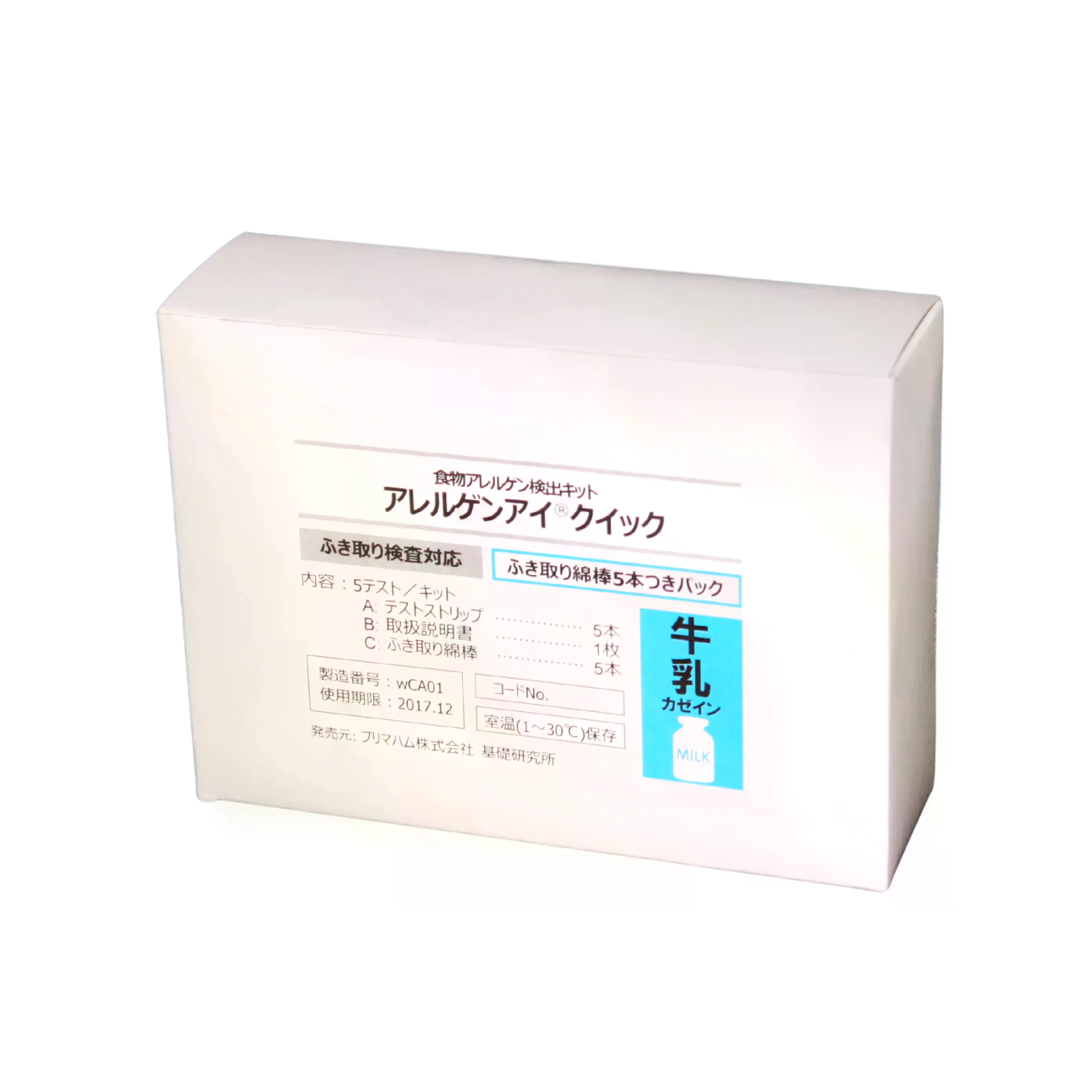 | 仕様 | ●検出項目:カゼイン ●仕様:ふき取り綿棒5本付パック ●検出感度:検査試料中0.2ppm(対象食物アレルゲンの総タンパク質) ●テスト時間:10分 ●保存方法:1~30℃(室温) ●セット内容:テストストリップ(個包装・乾燥剤入)×5本、ふき取り綿棒(内容液: リン酸緩衝生理食塩水(滅菌済) 10 mL/本)×5本 |