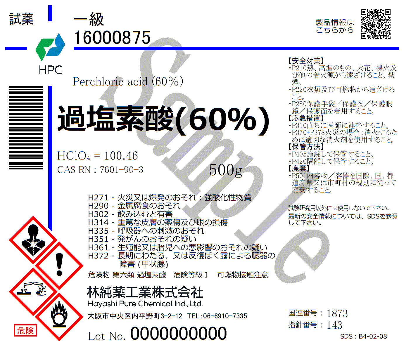 | 使用上の注意 | 強酸化性物質のため,還元剤,可燃性有機物などと混合すると急激な酸化反応を起こして発火又は爆発することがある。 70%以下の水溶液は,冷時は酸化力を持たないが,高温では非常に強力な酸化力をもち,有機物とは爆発的に反応することがあるため,これらとの接触を避ける。 |
