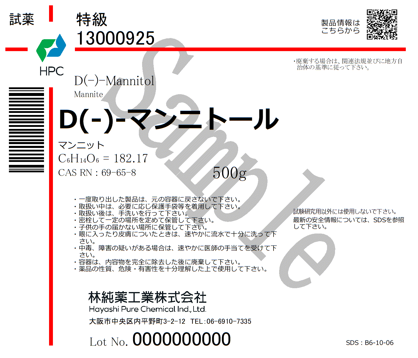 規格・用途:特級純度:≧99%CAS RN:69-65-8分子式:HOCH2(CHOH)4CH2OH分子量:182.17