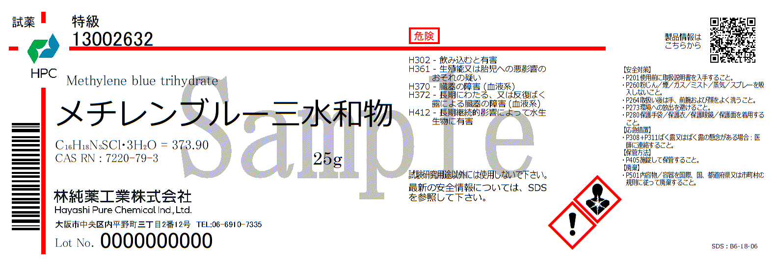 【英名】Methylene blue trihydrate 【和名】メチレンブルー / 3,7-ビス(ジメチルアミノ)フェノチアジニウムクロリド三水和物