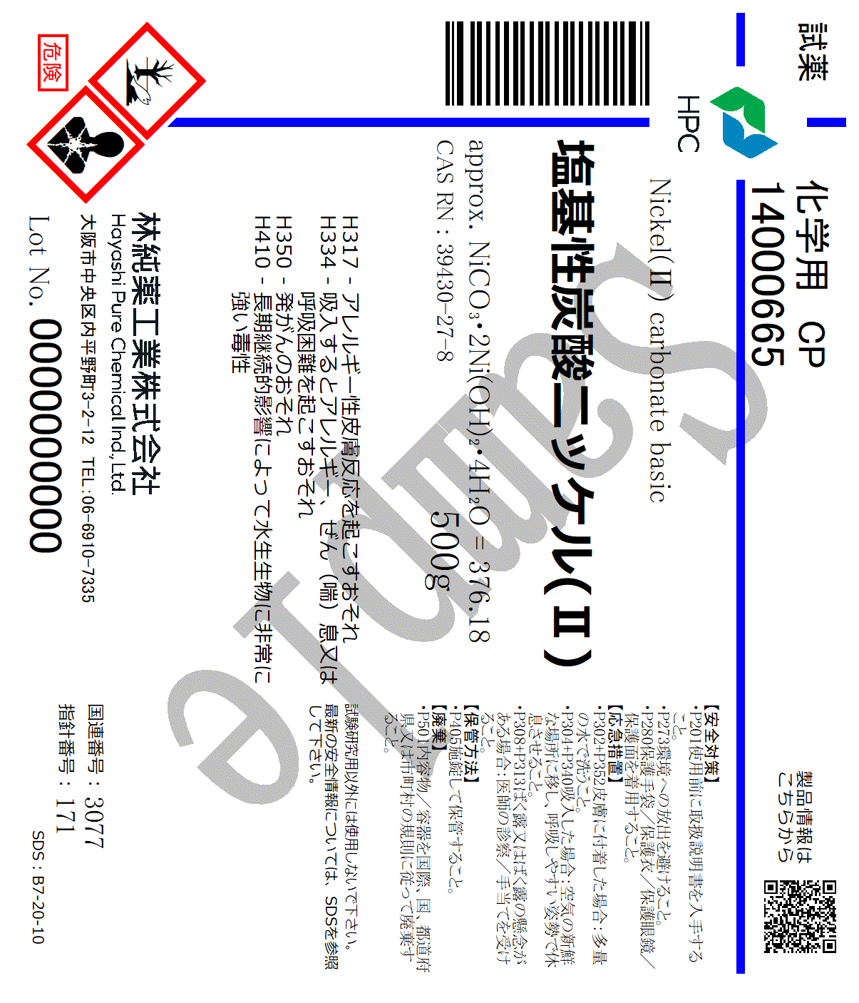 規格・用途:化学用 CP純度:42%(Niとして)CAS RN:39430-27-8分子式:approx.NiCO3・2Ni(OH)2・4H2O分子量:376.18