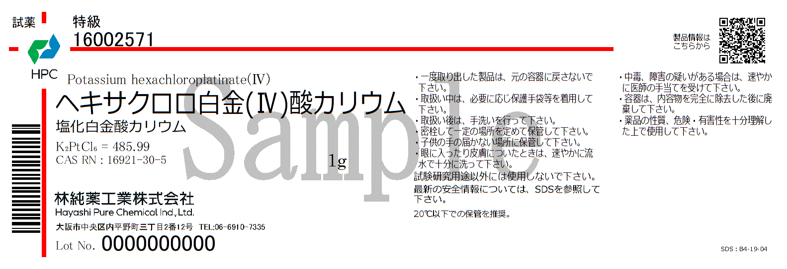 ヘキサクロロ白金(Ⅳ)酸カリウム 特級 (1g)