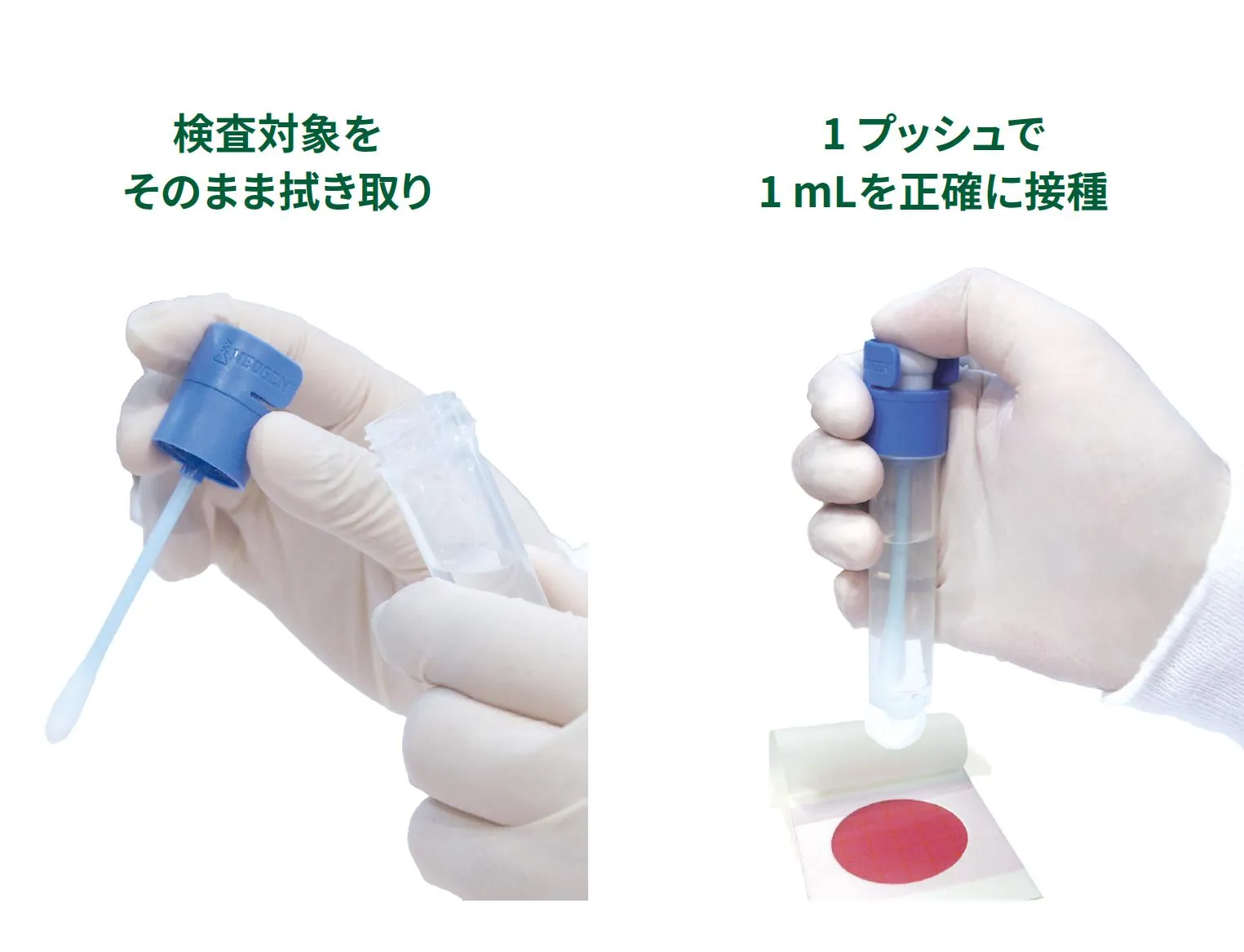 | 製品の特長 | 環境検査用の拭き取りスワブピペット機能付きで拭き取り~接種まで一本で完結 ●検査したい箇所を拭き取るだけで容易に検体を採取できます。 ●ピペット機能付きで1プッシュで1mLを正確に接種できます。 ●丈夫な自立式チューブで、試験管ラックにもそのまま格納可能です。 ●ペトリフィルム™培地と組み合わせて使用することで環境検査が、より正確に、迅速に、そして簡単に行えます。 |