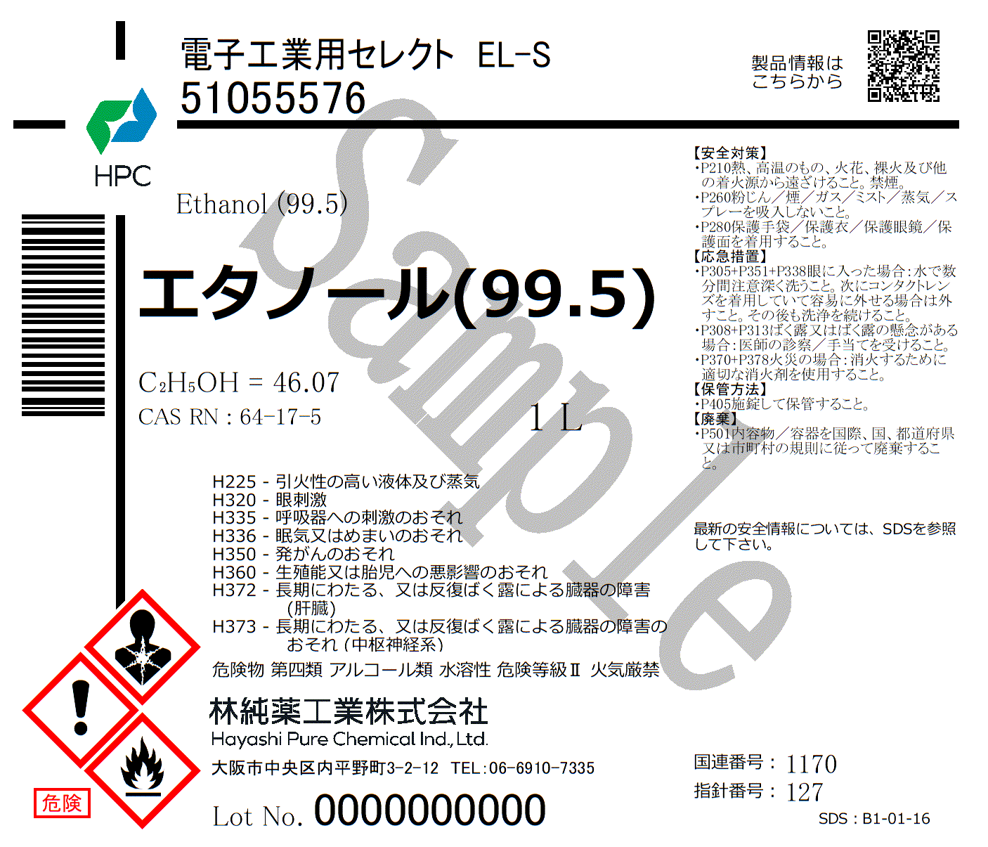 規格・用途:電子工業用セレクト EL-S純度:≧99.5%CAS RN:64-17-5分子式:C2H5OH分子量:46.07