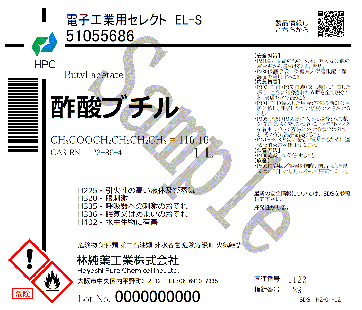 規格・用途:電子工業用セレクト EL-S純度:≧99.8%CAS RN:123-86-4分子式:CH3COO(CH2)3CH3分子量:116.16