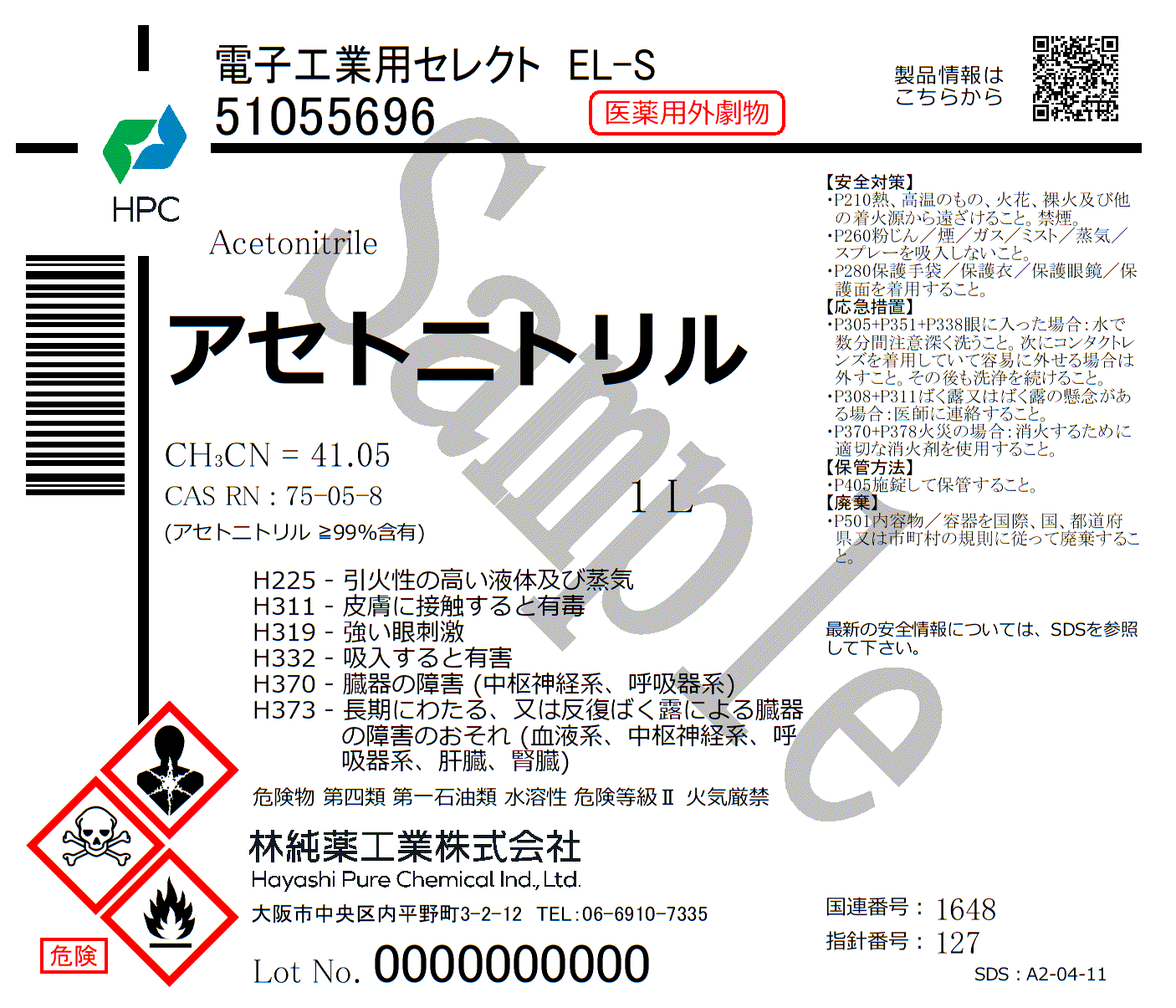 規格・用途:電子工業用セレクト EL-S純度:≧99.5%CAS RN:75-05-8分子式:CH3CN分子量:41.05