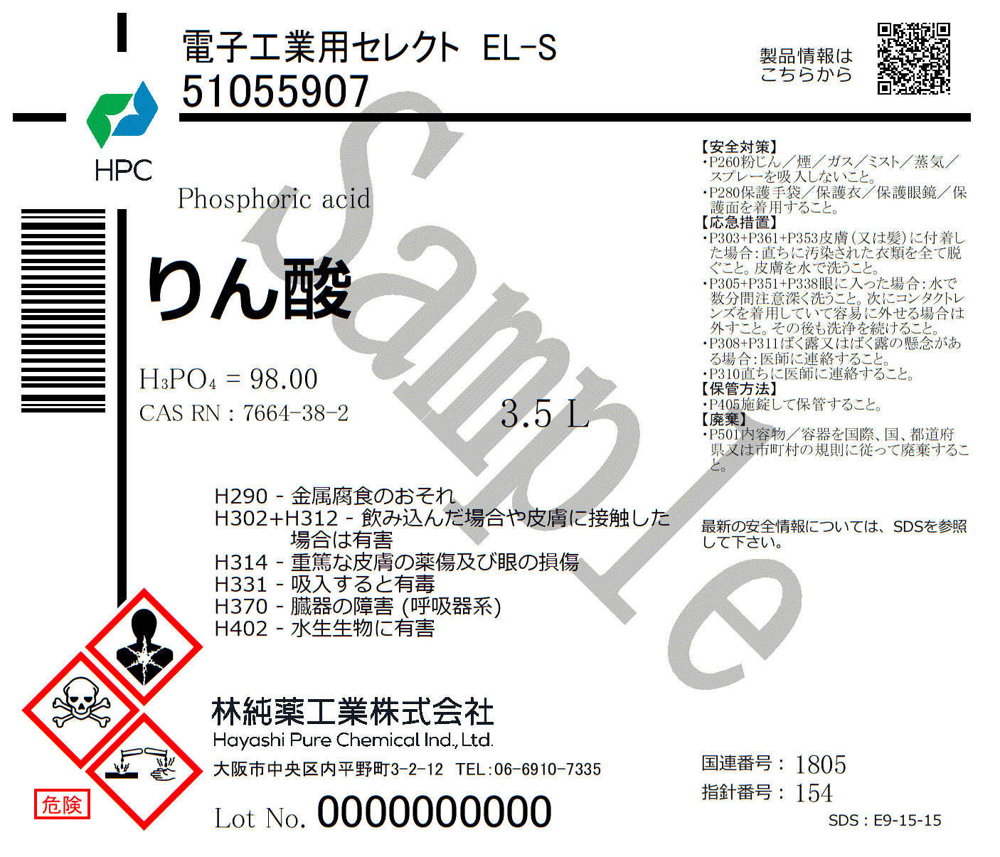 規格・用途:電子工業用セレクト EL-S純度:85.0-87.0%CAS RN:7664-38-2分子式:H3PO4分子量:98.00
