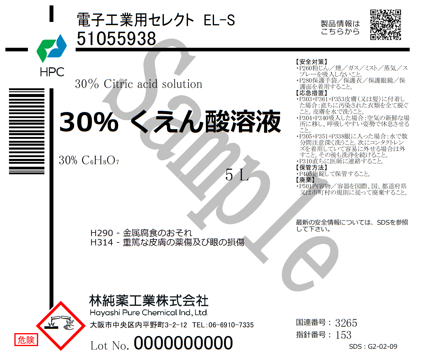 規格・用途:電子工業用セレクト EL-S純度:---CAS RN:77-92-9分子式:C6H8O7分子量:---